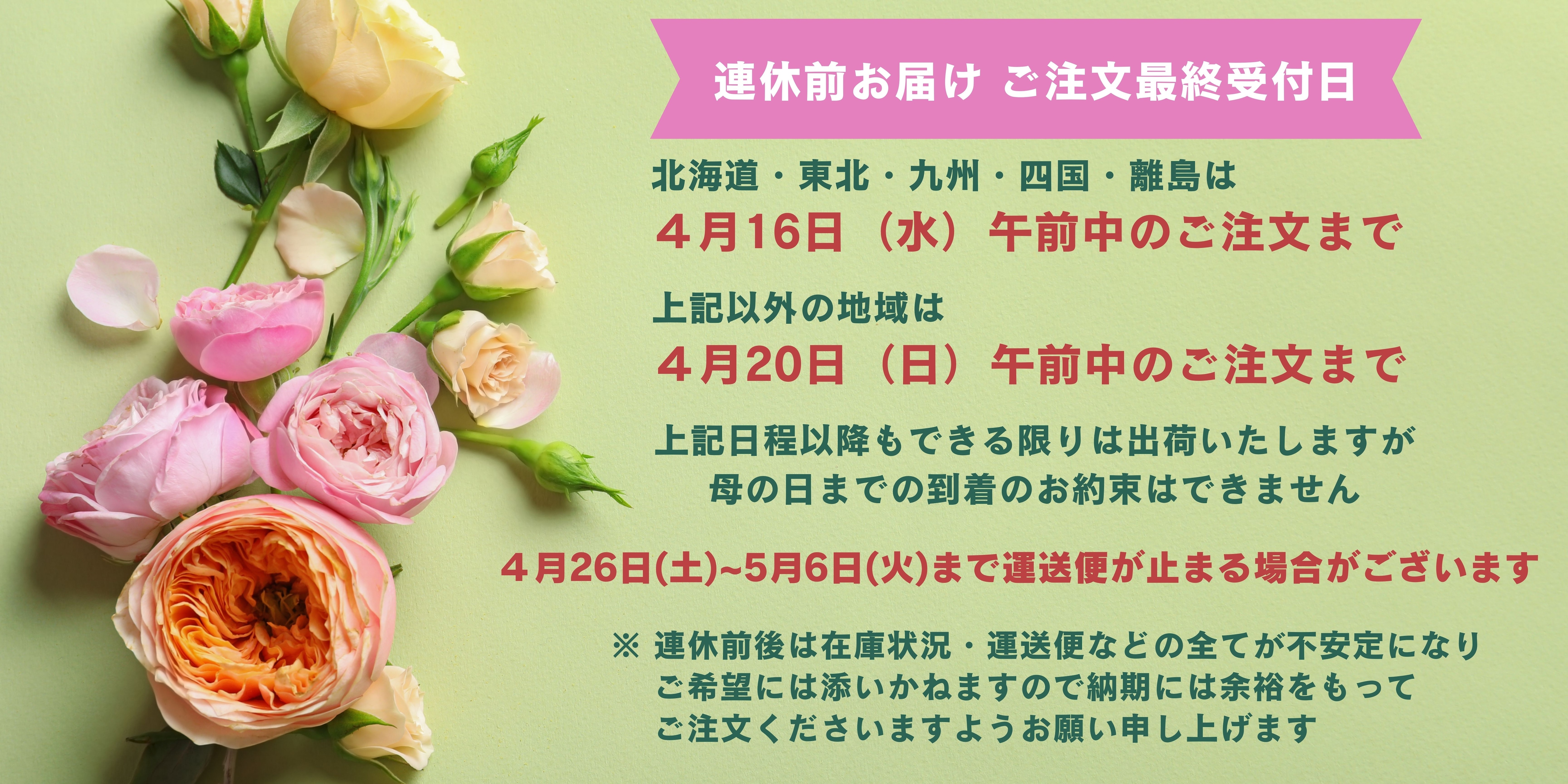 いつも木村包装をご愛顧いただき、誠にありがとうございます。 さて、2025年度ゴールデンウィーク前までのお届けが出来る最終受付日をご案内いたします。 下記よくご確認の上、余裕を持ってご注文いただきますようよろしくお願い申し上げます。